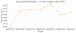 Grafik terlampir menampilkan harga penutupan spot gold harian antara 27 November — 3 Desember 2025, yang menunjukkan kenaikan mendadak dari akhir November, puncak pada 1 Desember, diikuti koreksi pada 2 Desember dan stabil kembali pada 3 Desember. (Data sumber: penyedia pasar historis).