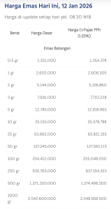 Pada perdagangan Senin (12/1/2026), harga emas Logam Mulia Antam naik Rp29.000 menjadi Rp2.631.000 per gram, melampaui rekor sebelumnya dan menandai level tertinggi sepanjang masa. Kenaikan serupa juga terjadi pada harga buyback, yang kini berada di Rp2.484.000 per gram, juga naik Rp29.000 dibandingkan perdagangan akhir pekan lalu.