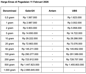 DCNews, Jakarta — PT Pegadaian (Persero) kembali merilis perkembangan harga emas batangan yang diperdagangkan melalui layanannya. Namun hingga Rabu (11/2/2026), harga emas Antam belum juga tercantum di situs resmi Sahabat Pegadaian, memperpanjang absennya produk logam mulia paling populer di Tanah Air dari etalase penjualan perusahaan pelat merah tersebut.